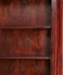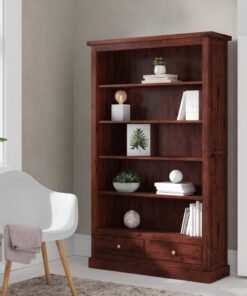 Handmade from Solid Mango Wood featuring brass handles and 5 shelf and 2 drawers in dark Mahogany hue.