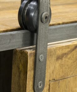 The sliding door hangs on a steel rail and covers 2 of the 4 open shelves which provide plenty of accessible storage space.