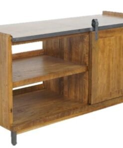 The sliding door hangs on a steel rail and covers 2 of the 4 open shelves which provide plenty of accessible storage space.